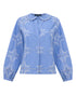Add a touch of whimsy to your wardrobe with the French Connection Grayson Peter Pan Collar Top in dreamy blue and white. Delicate embroidery, bishop sleeves, and a classic Peter Pan collar create an enchanting, country-inspired vibe. The button-down front and V-neck keep it effortless and versatile. Style with a midi skirt and ballet flats for a charming countryside look.- Women's
